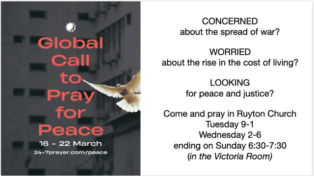 During this week it will be staffed during the times listed below. Please come and spend a little while in reflection and prayer for the issues of our World.